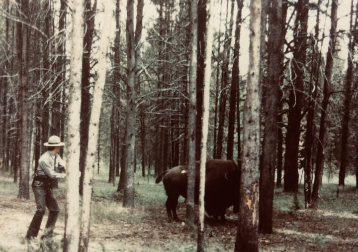 The interpretive ranger stopped dead in his tracks as I wove through the trees with the bison in pursuit. It turned into a foot race — and somehow, I won.